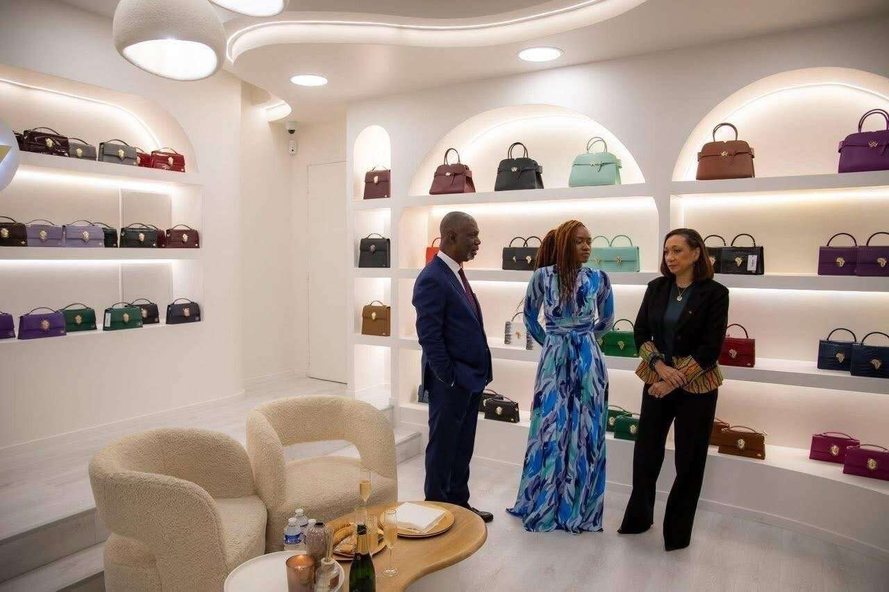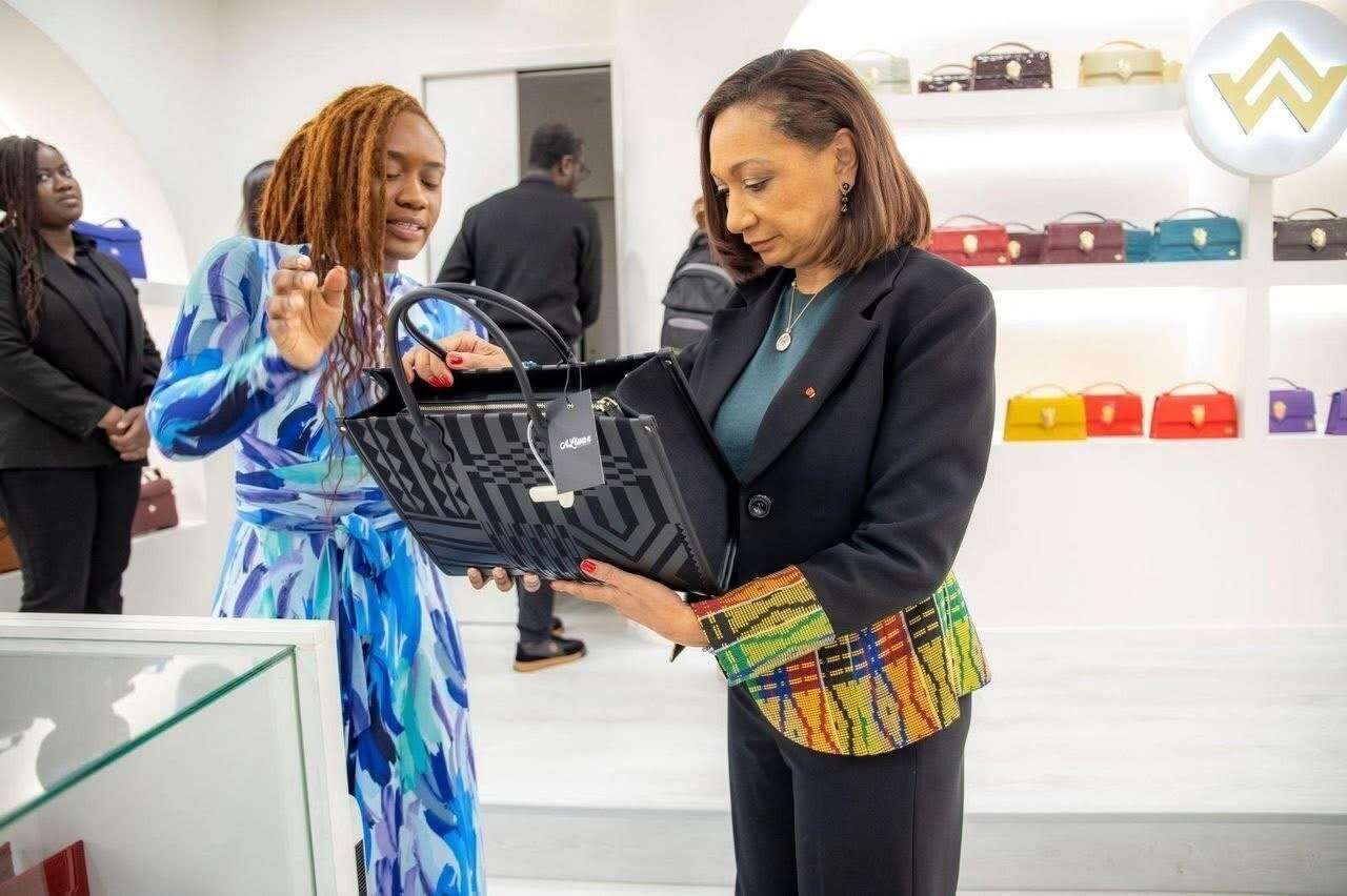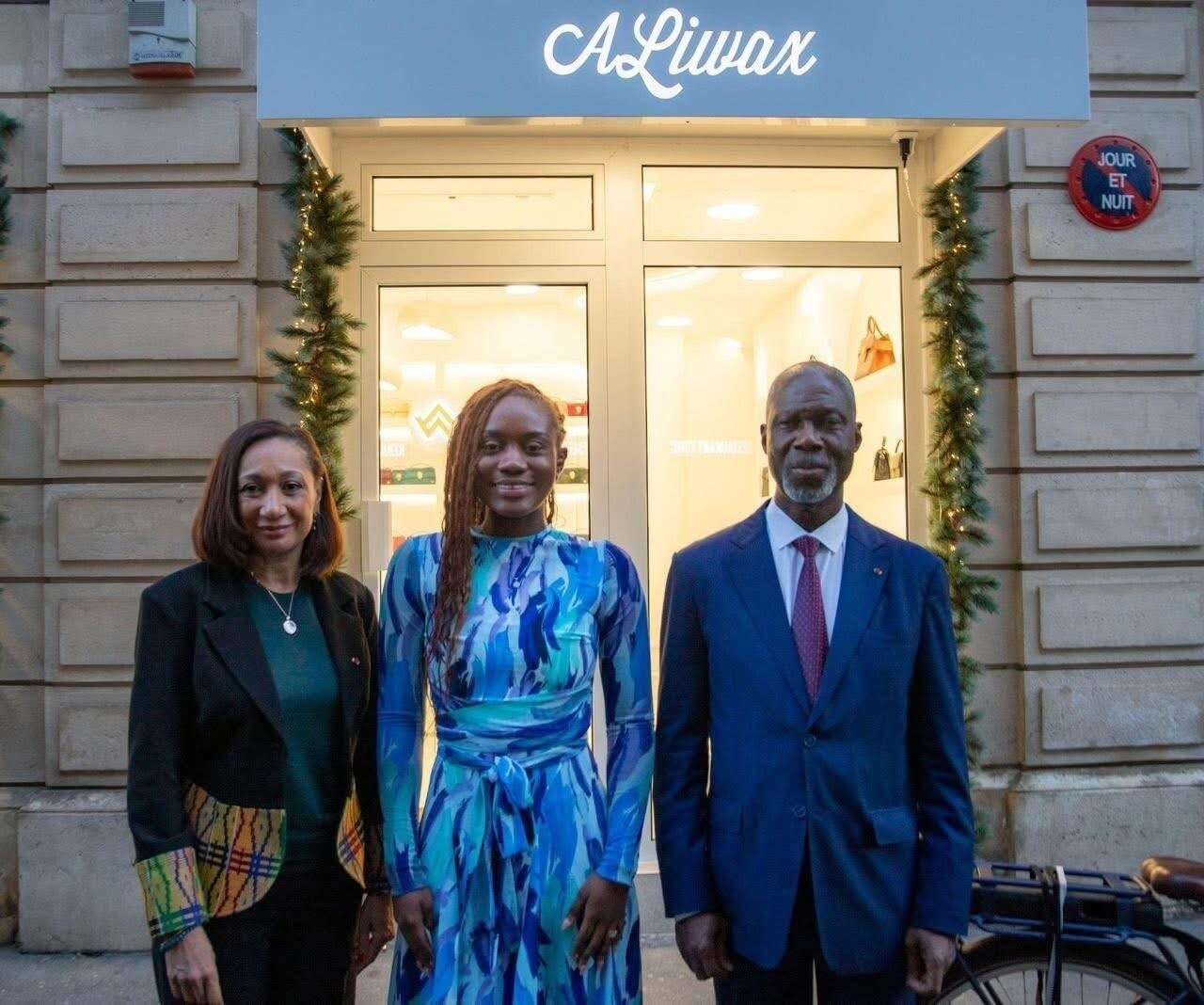 En visite officielle à Paris, Françoise Remarck, accompagnée de Maurice Kouakou Bandaman, s’est rendue à la boutique Aliwax, fondée par Alice Gnapa, à proximité de la prestigieuse Avenue des Champs-Élysées, pour saluer l’engagement de cette entrepreneure ivoirienne dans la promotion du Made in Côte d’Ivoire et du savoir-faire créatif ivoirien à l’international. – © Ambassade de Côte d'Ivoire en France.