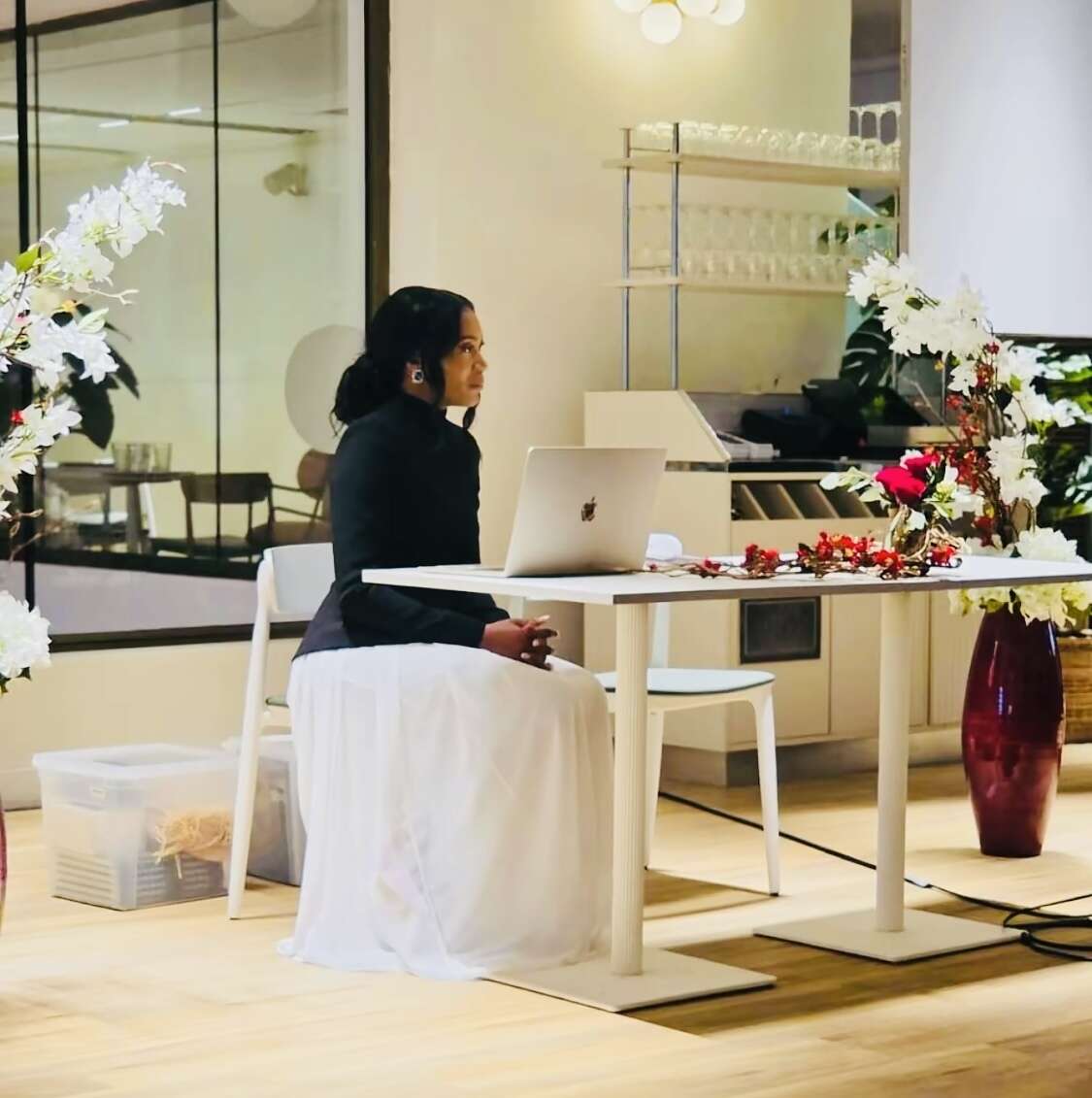 À mesure qu’ils avancent, les participants – une cinquantaine en présentiel, rejoints par une vingtaine d’autres connectés en ligne – semblent pénétrer dans un espace suspendu, à la frontière entre événement culturel et expérience introspective. La décoration florale, signée Simmala Flower Time, le fleuriste bienveillant d’Alfortville fondé par Simmala Lyfoung, transforme le lieu en un écrin chaleureux et apaisant. Les bouquets et compositions délicates, disposés avec soin, créent une atmosphère d’ouverture et de sororité, invitant chacun à se laisser porter par le moment et à se préparer à l’écoute attentive et au partage.