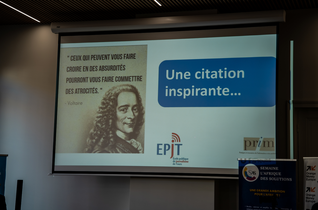 Le conférencier a notamment présenté Factoscope.fr, le portail francophone de vérification des faits qu’il a fondé, ainsi que les initiatives africaines qu’il accompagne : #StopATenè (Stop aux on-dits) et #EkengeToujours (Vigilance Toujours). Ces programmes, déjà déployés dans 16 pays à travers 32 médias partenaires, favorisent la formation des journalistes, des enseignants et des jeunes à la vérification des contenus numériques.